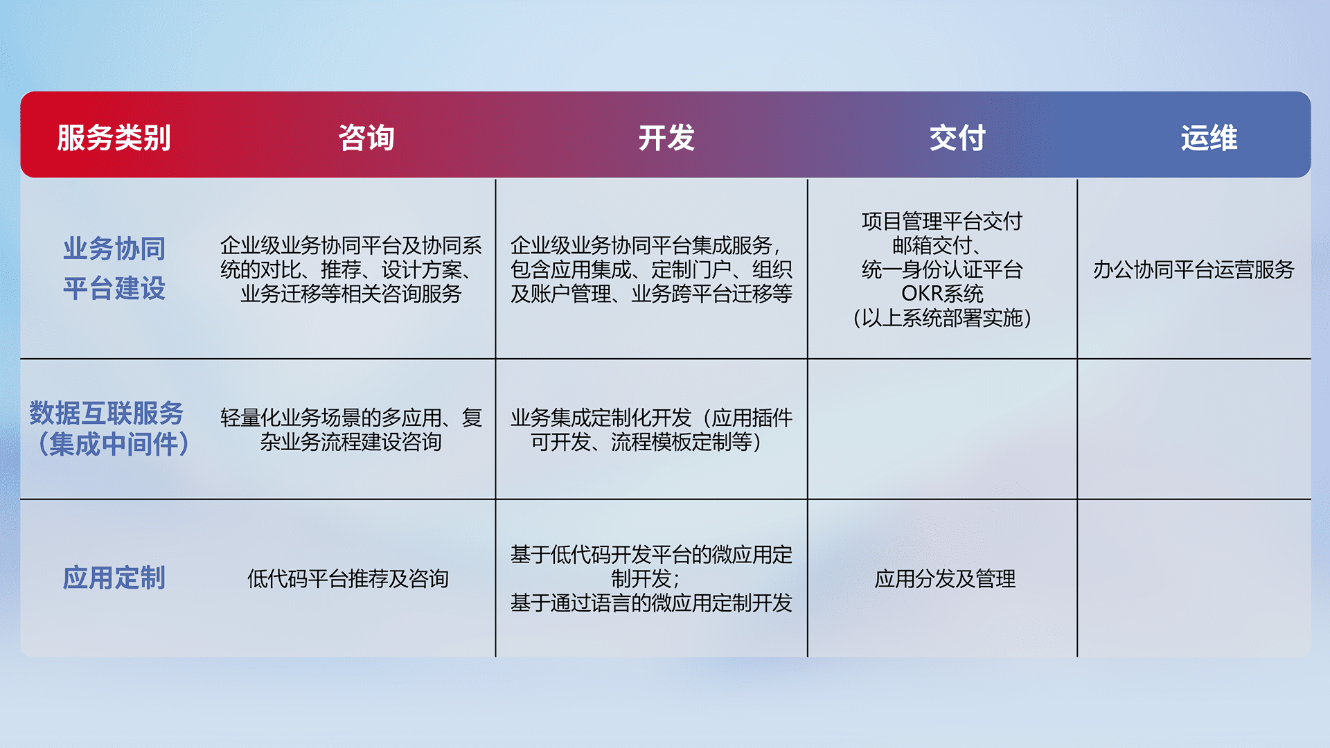 针对钉钉、、、企微、、IDaas等平台级产品提供产品的规划、、、方案、、、、交付、、、定制化开发等服务,,,,实现如统一协同办公、、智能客户服务、、、混合会议管理、、智能数据查询、、、等业务场景,,实现数字化转型。。。。