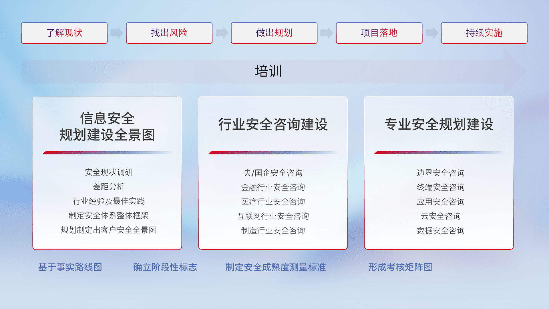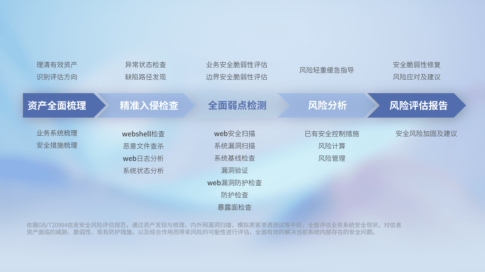 针对客户行业特性,,,,以专业的安全服务+多厂商联合解决方案提供专属的一站式安全管理服务,,,帮助客户全面感知网络空间威胁,,基于识别、、、检测、、、、分析、、、防护、、、、监测、、响应的服务理论模型,,,从方案咨询、、、、集成交付、、、、评估验证、、、、优化加固、、、运维运营,,致力于为客户提供完整的闭环管理式安全服务。。。。以实战经验为客户打造高抵御风险的安全体系,,,帮助客户发现威胁、、、、对抗威胁、、、处置威胁,,不断积累安全对抗能力,,,持续保障数字化安全。。。。